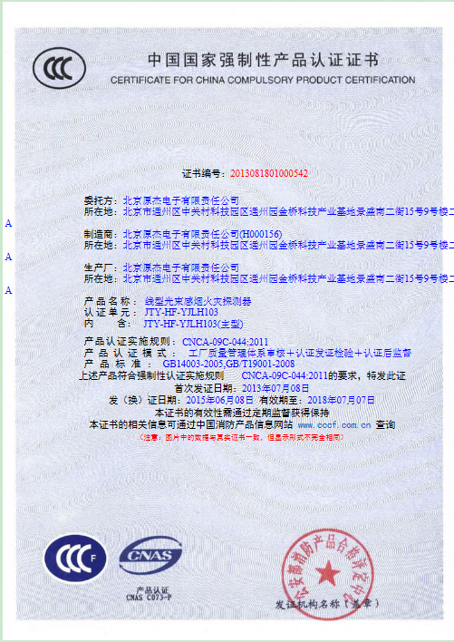 所生产的线型光束感烟火灾探测器成功通过CCCF认证!