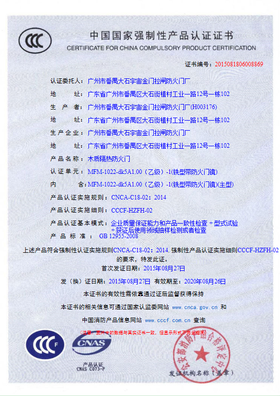 热烈祝贺广州市番禺大石宇宙金门拉闸防火门厂 产品:木质隔热防火门 成功通过消防产品3C认证