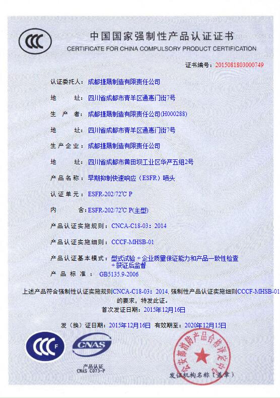 成都捷晟制造有限责任公司 产品:ESPR喷头 成功通过消防产品3C认证