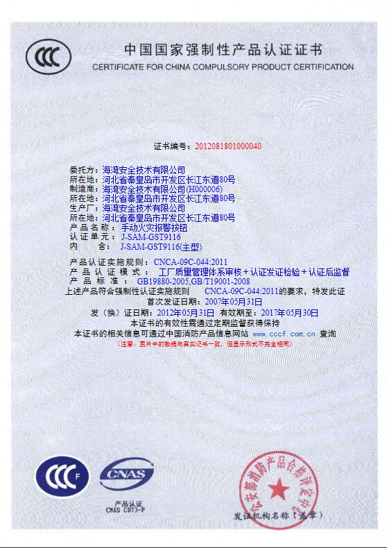 手动火灾报警按钮 成功通过消防产品3C认证