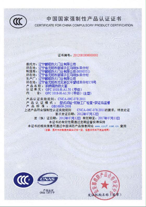 热烈祝贺辽宁鹏程防火门业有限公司 产品:钢质隔热防火窗 成功通过消防产品3C认证